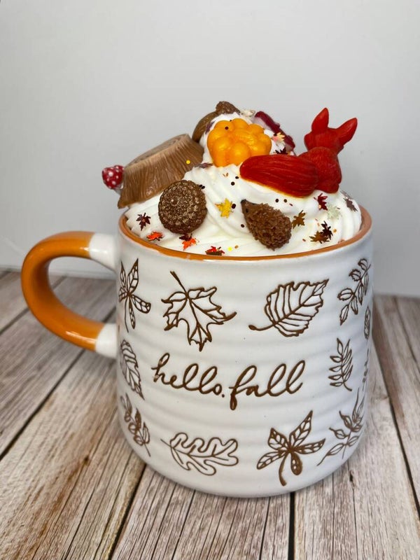 Handgegossen mit viel Liebe und dekoriert wie ein cremiges Herbstgetränk in einer gemütlichen „Hello Fall“-Tasse – mit Mini-Fuchs, Pilzen, Kürbis und herbstlichen Details. 🦊🍁 Ein echter Hingucker für die goldene Jahreszeit – aber Vorsicht: nicht zum Anbeißen! ☕🎃