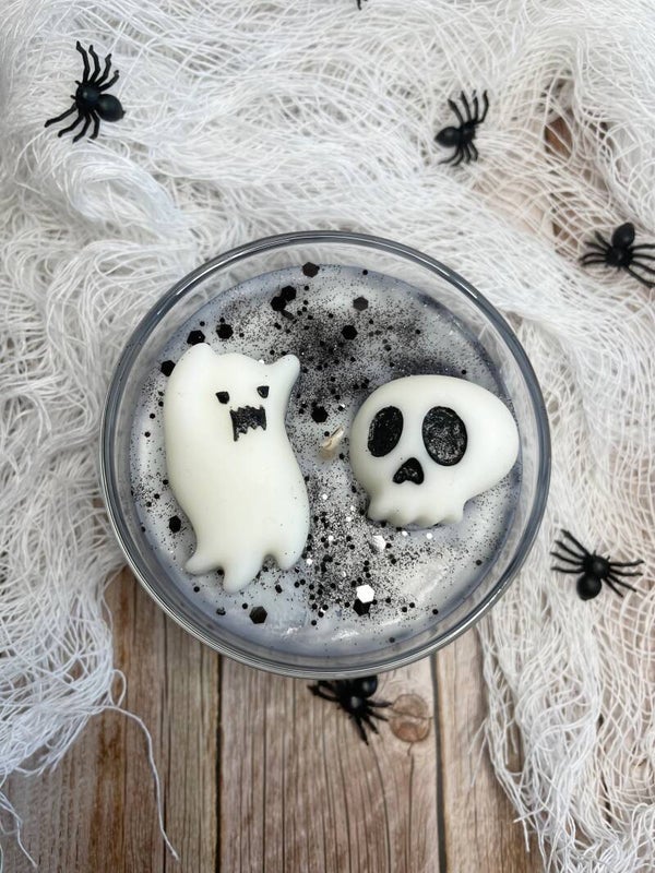 Handgegossen in liebevoller Handarbeit, dekoriert mit kleinen Geistern, Totenkopf und schwarzem Glitzer – ein echter Hingucker für die spooky Season. 🕯️✨