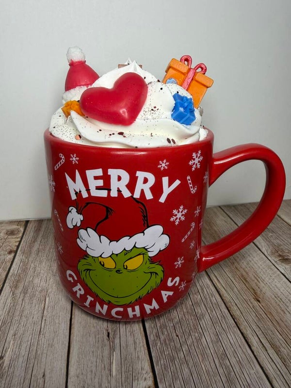 Mit ihrer auffälligen Weihnachtstasse in kräftigem Rot und der detailreichen Wachshaube ist diese Kerze ein echter Blickfang. Die cremige, schneeweiße Oberfläche wird von liebevoll handgefertigten Wachsdekorationen wie Tannenbaum, Geschenk und Weihnachtsmütze gekrönt und mit feinen Streuseln veredelt. Ein Design, das Weihnachtsstimmung versprüht – mit einem Augenzwinkern.